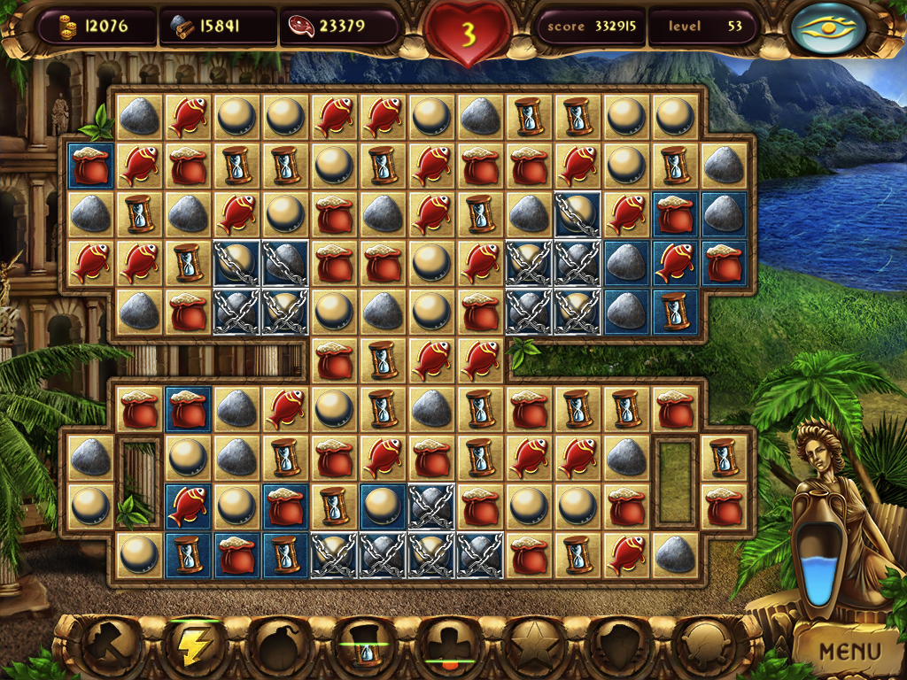 Cradle of Rome brings something extra to the table that keeps the game interesting. The object of the game isn’t to complete 100 puzzles, it’s to build Rome, and here’s how that’s done. Each round has five different tiles that fit into these four categories: power-ups, food, gold, and supplies. While trying to eliminate all the blue tiles you’ll be collecting food, gold and supplies, which will be used to help build Rome. Once you have a set amount of food, supplies, and gold you’ll be able to construct one of the masterpieces of Roman architecture. With each new structure that is built you get a new tile type. The new tiles bring you the same thing as the previous tiles, just more of it. For example, a chicken leg brings in 3 units of food.