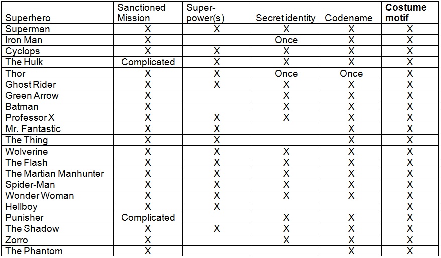So how do the Marvel’s and DC’s so-called superheroes stack up when dissected along these three elements? Would they still be considered superheroes? I compared a number of comic book characters, and threw in two pulp heroes, to see how well they met the criteria. This graphic shows my thoughts.