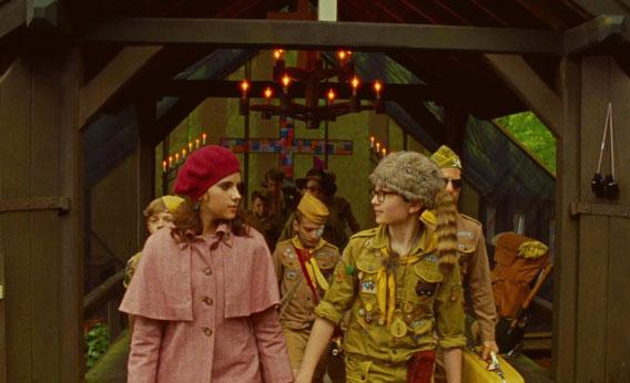None of this would work with the wrong child actors, but the ones Anderson has here are perfect. Sam and Suzy are two lonely souls who have bonded over their mutual oddness, and they are both quirky in always endearing, never irritating ways. That’s because their eccentricities stem from deeply relatable personal pains and frustrations. Sam is the perfect Boy Khaki Scout, an expert in tent-pitching, campfire-making, navigating, and all related skills. His relentless perfectionism belies the utter lack of control he has over his troubled life. Suzy, meanwhile, is a devoted literature lover, to the point where she brings a suitcase full of books in lieu of a change of clothes on their escapade. Her ever-present binoculars symbolize her perpetual remove from other people, brought on by her anxiety over her parents’s crumbling marriage. Gilman and Hayward are the best young duo to debut in a film since the kids in Let the Right One In, so adept are they at inhabiting their characters. And I’d be remiss if I didn’t mention the Khaki Scout troop, who are just as perfectly cast.
