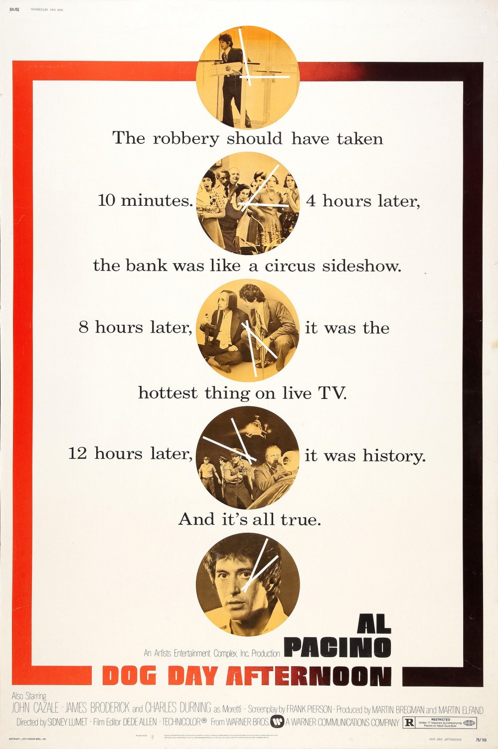 Directed by Sidney Lumet. Originally released in 1975. Based on true events that had taken place three years before. Sonny Wortzik (Al Pacino) tries to rob a bank, only for the situation to rapidly deteriorate. As police and media mass outside, Sonny desperately tries to negotiate an out for himself, while a police detective (Charles Durning) tries to reason with him.