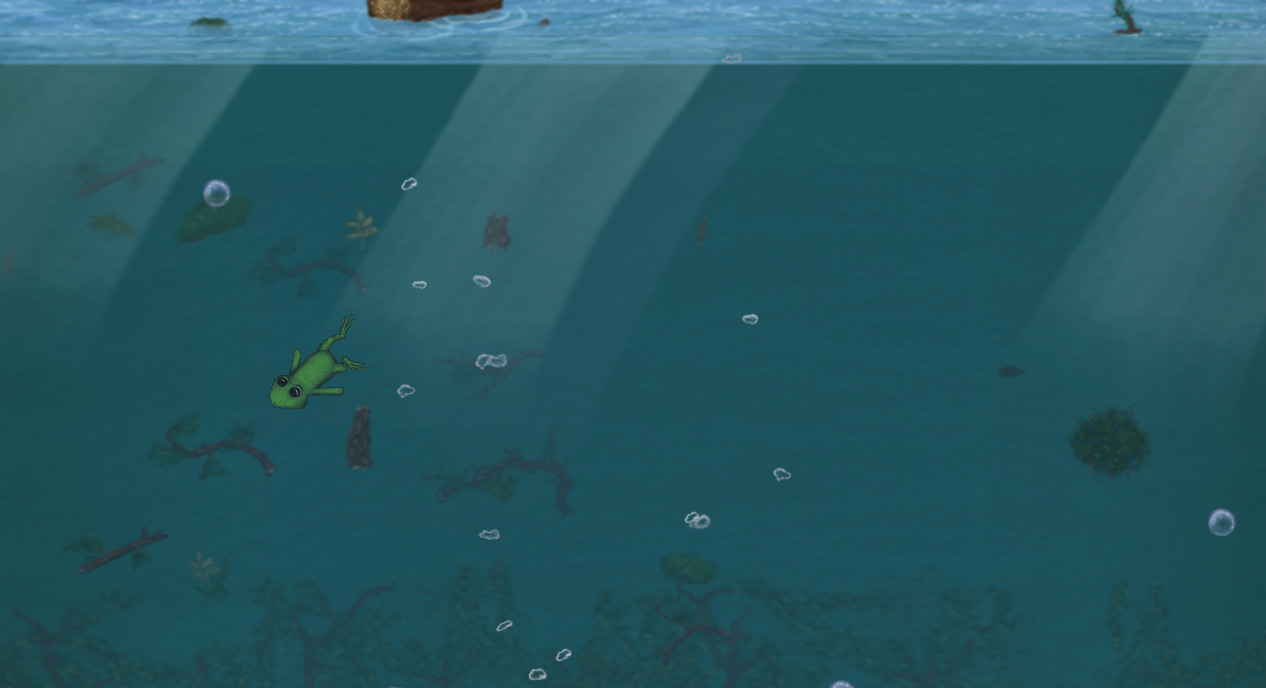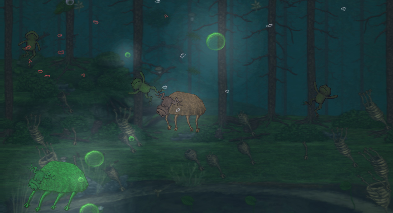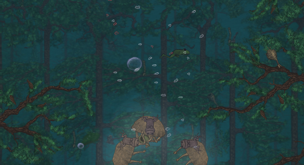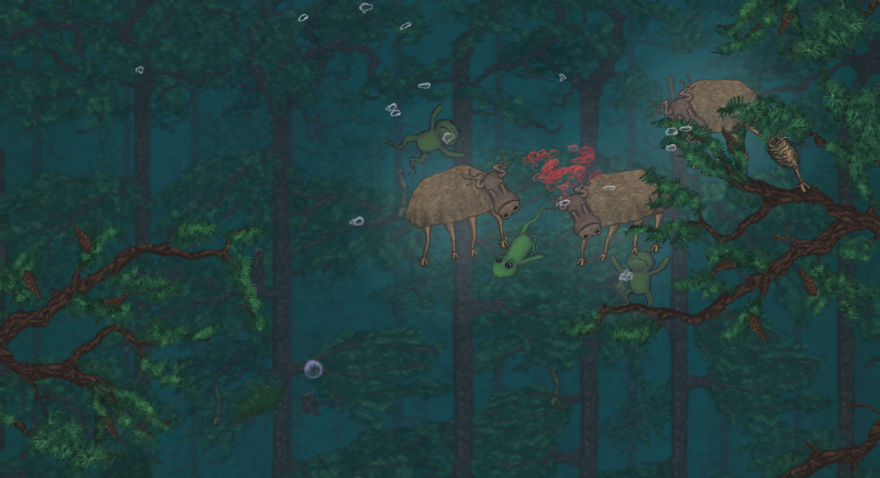 The old design relied a lot on scripted background events to convey how the game’s ecosystem worked, but this time we decided to actually show it with game logic, and so the helpless frogs were born. They give the player something to save (or just bully if they’re that kind of player), and they reveal through their interactions with enemies exactly what it is that’s really going on in the forest. This made the game a lot more dynamic, and less like watching a movie.