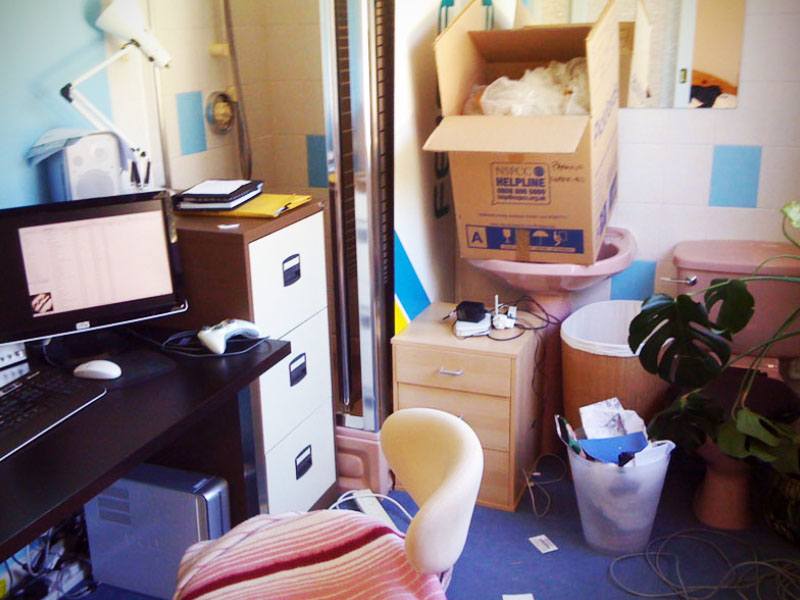 The pink toilet, sink and shower are remnants of a room that has been all but replaced by a budding game developer whose interesting use of space has caused an internal dilemma – hygiene or hijinks.