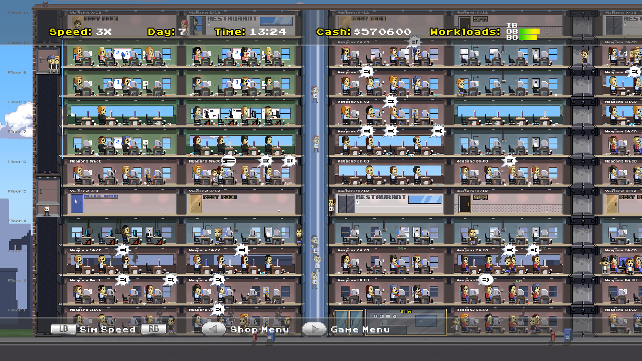 One thing that really changes this game up is what happened to me, which I think might have happened to you had you played it longer. It was on about day 150 and my main client (I was making up to about $85k a day since I kept expanding and got up to about 20 floors) and the workload on my main client completely dropped.