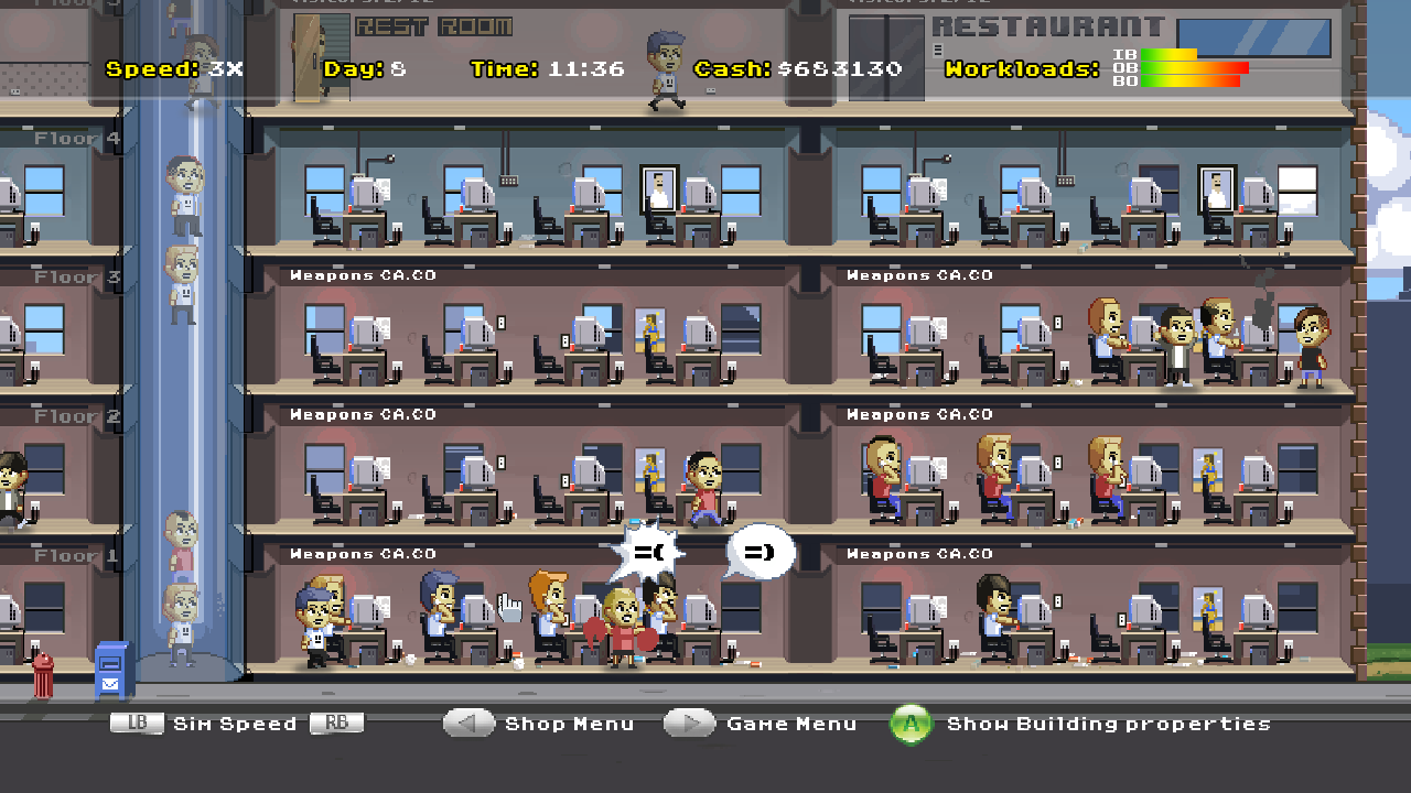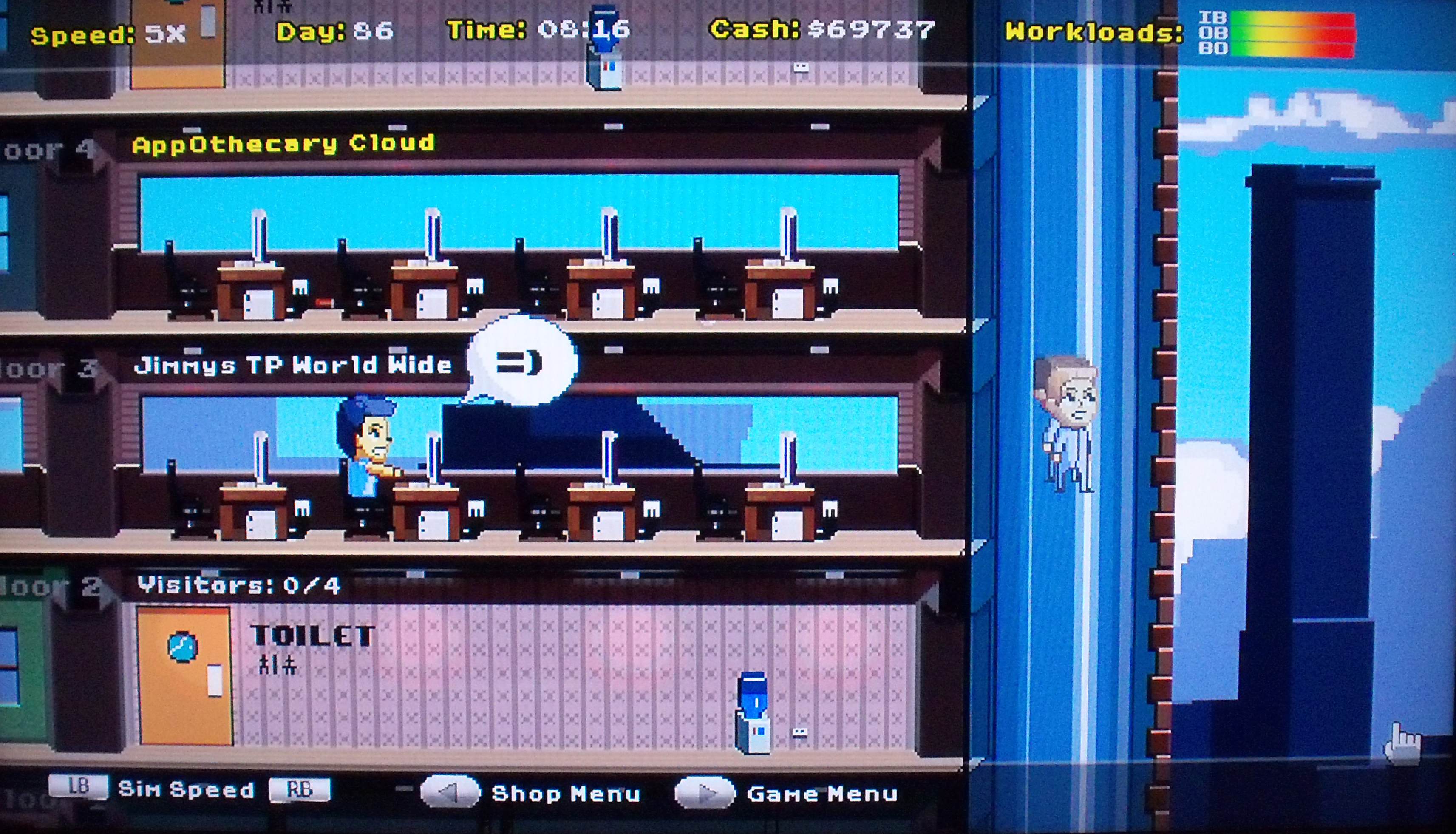 The micromanagement adds a sort of puzzle aspect to Smooth. You have to deal with angry employees and the prospect of being penalized if you don’t fulfill the vendor’s quota for the day (you can have negative money after a penalty, and workers are not especially happy if they don’t get paid for the day). You have to sprinkle in bathrooms and cafeterias so your staff doesn’t run home every hour for a potty and/or snack break. You need to stack the work place with a plethora of IT to kick the non-working computers into action, or risk the call center coming to a screeching halt. Then you need to overrun the place with an army of janitors to spruce up the place so your entire staff doesn’t give-up and quit while waiting for the one elevator to bring them to their floor.